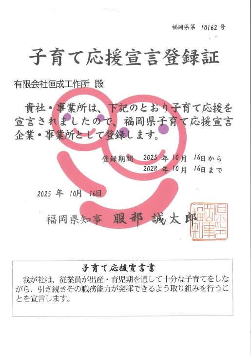 2025年10月24日(金) お知らせ NEW 子育て応援宣言企業に登録しました。 子育て応援宣言企業に登録しました。 仕事と子育ての両立ができる職場環境づくりに取り組んでいきます。 有限会社 恒成工作所 代表取締役 恒成和幸